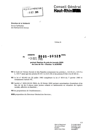 portant fixation du prix de journée 2005 du lieu de vie "Ocarina" à AUBURE. Resumé Pièces jointes ARRETE Assemblée : Non défini Date : 03/10/2005 Rapporteur : Non défini Collectivité : Conseil départemental du Haut-Rhin Direction : Non défini Service : Service de la Tarification des Etablissements Domaine : Prix de Journée Commission :