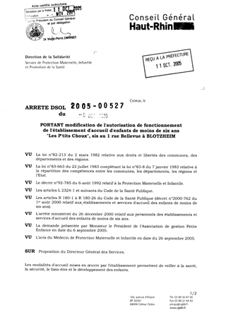 portant modification de l'autorisation de fonctionnement de l'établissement d'accueil d'enfants de moins de six ans "Les P'tits Choux", sis au 1 rue Bellevue à BLOTZHEIM. Resumé Pièces jointes ARRETE Assemblée : Non défini Date : 06/10/2005 Rapporteur : Non défini Collectivité : Conseil départemental du Haut-Rhin Direction : Non défini Service : Service de Protection Maternelle et Infantile Domaine : Accueil d'enfants Commission :