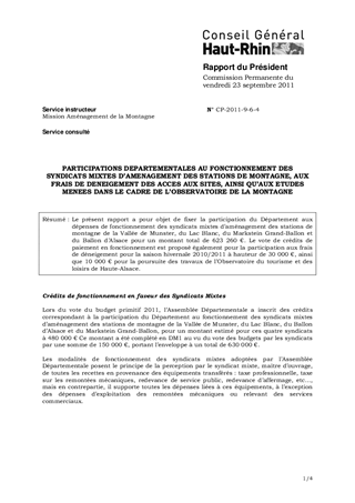 Le présent rapport a pour objet de fixer la participation du Département aux dépenses de fonctionnement des syndicats mixtes d’aménagement des stations de montagne de la Vallée de Munster, du Lac Blanc, du Markstein Grand-Ballon et du Ballon d’Alsace pour un montant total de 623 260 €. Le vote de crédits de paiement en fonctionnement est proposé également pour la participation aux frais de déneigement pour la saison hivernale 2010/2011 à hauteur de 30 000 €, ainsi que 10 000 € pour la poursuite des travaux de l’Observatoire du tourisme et des loisirs de Haute-Alsace.