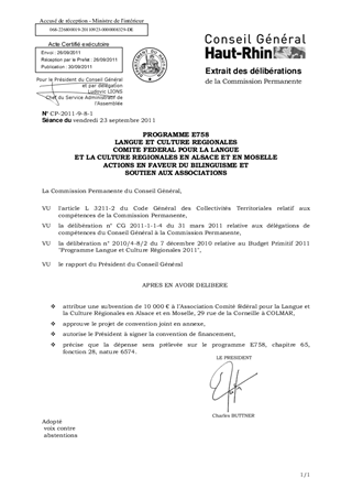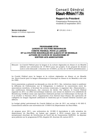 PROGRAMME E758 LANGUE ET CULTURE REGIONALES COMITE FEDERAL POUR LA LANGUE ET LA CULTURE REGIONALES EN ALSACE ET EN MOSELLE ACTIONS EN FAVEUR DU BILINGUISME ET SOUTIEN AUX ASSOCIATIONS