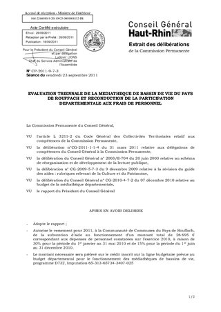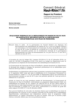 EVALUATION TRIENNALE DE LA MEDIATHEQUE DE BASSIN DE VIE DU PAYS DE ROUFFACH ET RECONDUCTION DE LA PARTICIPATION DEPARTEMENTALE AUX FRAIS DE PERSONNEL
