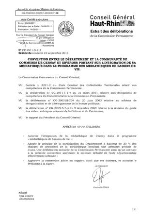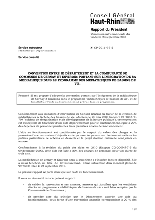 CONVENTION ENTRE LE DÉPARTEMENT ET LA COMMUNAUTÉ DE COMMUNES DE CERNAY ET ENVIRONS PORTANT SUR L'INTEGRATION DE SA MEDIATHEQUE DANS LE PROGRAMME DES MEDIATHEQUES DE BASSINS DE VIE.