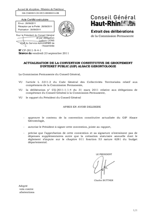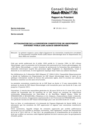 Le présent rapport a pour objet d'approuver la convention constitutive actualisée du Groupement d'Intérêt Public (GIP) Alsace Gérontologie dont le Département du Haut-Rhin est membre.
