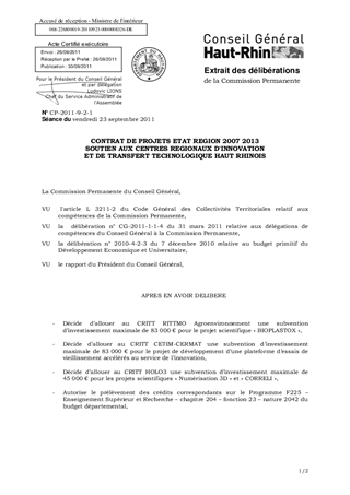 CONTRAT DE PROJETS ETAT REGION 2007 2013 SOUTIEN AUX CENTRES REGIONAUX D'INNOVATION ET DE TRANSFERT TECHNOLOGIQUE HAUT RHINOIS