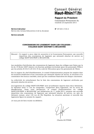Ce rapport a pour objet de soumettre à la Commission Permanente une nouvelle répartition des concessions de logement par nécessité absolue de service au collège SAINT EXUPERY à MULHOUSE.