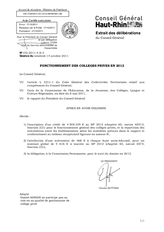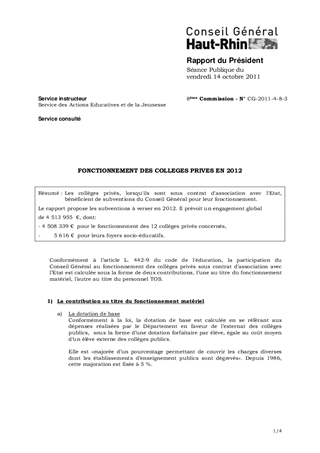 Les collèges privés, lorsqu'ils sont sous contrat d'association avec l'Etat, bénéficient de subventions du Conseil Général pour leur fonctionnement. Le rapport propose les subventions à verser en 2012. Il prévoit un engagement global de 4 513 955 €, dont: - 4 508 339 € pour le fonctionnement des 12 collèges privés concernés, - 5 616 € pour leurs foyers socio-éducatifs.