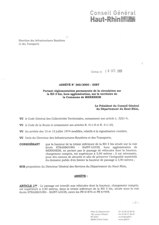 portant réglementation permanente de la circulation sur la RD 3 bis, hors agglomération, sur le territoire de la commune de MERXHEIM. Resumé Pièces jointes ARRETE Assemblée : Non défini Date : 18/10/2005 Rapporteur : Non défini Collectivité : Conseil départemental du Haut-Rhin Direction : Non défini Service : Direction des Routes Domaine : Circulation Commission :