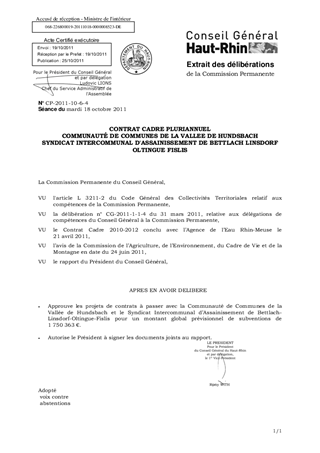 Il vous est proposé d'approuver et d'autoriser le Président à signer les projets de contrats d'assainissement avec la Communauté de Communes de la Vallée de Hundsbach et le Syndicat Intercommunal de Bettlach-Linsdorf-Oltingue-Fislis pour un montant global de subventions de 1 750 363 € étalé sur trois ans (2011-2013)