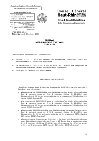 Dans le cadre de la démarche GERPLAN, le Département est sollicité pour : - la réalisation de sentiers d’interprétation à BEBLENHEIM, RIQUEWIHR et OBERSAASHEIM, - la renaturation de zones d’activités et industrielles à CERNAY et UFFHOLTZ, - la renaturation d’une zone humide « Les Vernettes » à VALDIEU-LUTRAN, - le programme de sensibilisation à l’environnement mené par la communauté de communes de la Vallée de Kaysersberg en 2011. Il vous est proposé de financer ces demandes pour un montant total de 33.211 €.