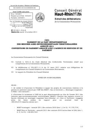C851 PAIEMENT DE LA PART DÉPARTEMENTALE DES MESURES AGRO-ENVIRONNEMENTALES TERRITORIALISÉES ANNUITÉ 2011 CONVENTIONS DE PAIEMENT ASSOCIÉ AVEC L’AGENCE DE SERVICES ET DE PAIEMENT