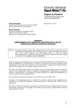 Le présent rapport a pour objet d'approuver les termes de la convention avec la société Hyper U définissant les conditions de mise en oeuvre de l'offre de concours que cette société apportera au Département dans le cadre du projet d'aménagement d'un carrefour giratoire sur la RD 201, à hauteur de l'actuel accès à la carrière, hors agglomération de SIERENTZ.
