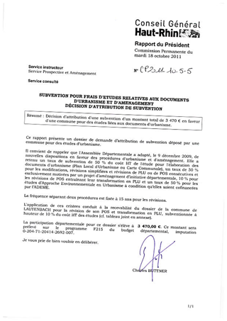 SUBVENTION POUR FRAIS D'ETUDES RELATIVES AUX DOCUMENTS D'URBANISME ET D'AMENAGEMENT DECISION D'ATTRIBUTION DE SUBVENTION Resumé Pièces jointes DELIBERATION RAPPORT Assemblée : Commission Permanente Date : 18/10/2011 Rapporteur : Non défini Collectivité : Conseil départemental du Haut-Rhin Direction : Non défini Service : Service Prospective et Aménagement Domaine : Aides / Subventions Commission : Commission Permanente