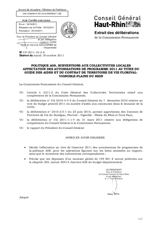 POLITIQUE A08, SUBVENTIONS AUX COLLECTIVITES LOCALES AFFECTATION DES AUTORISATIONS DE PROGRAMME 2011 AU TITRE DU GUIDE DES AIDES ET DU CONTRAT DE TERRITOIRE DE VIE FLORIVAL-VIGNOBLE-PLAINE DU RHIN
