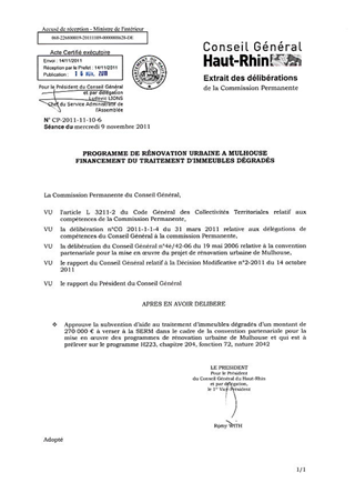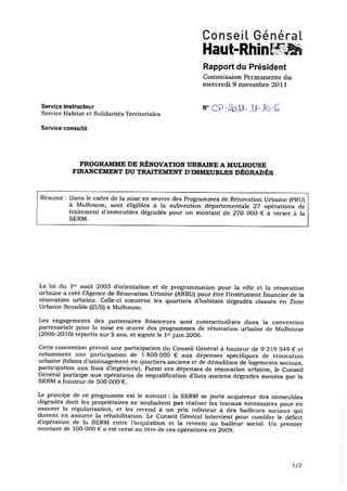 PROGRAMME DE RENOVATION URBAINE A MULHOUSE FINANCEMENT DU TRAITEMENT D'IMMEUBLES DEGRADES Resumé Pièces jointes DELIBERATION RAPPORT Assemblée : Commission Permanente Date : 09/11/2011 Rapporteur : Non défini Collectivité : Conseil départemental du Haut-Rhin Direction : Non défini Service : Service Habitat et Solidarités Territoriales Domaine : Habitat Commission : Commission Permanente