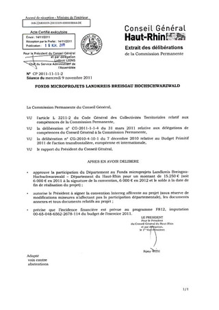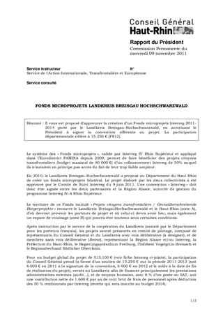 Il vous est proposé d'approuver la création d'un Fonds microprojets Interreg 2011-2014 porté par le Landkreis Breisgau-Hochschwarzwald, en autorisant le Président à signer la convention afférente au projet. La participation départementale s'élève à 15.250 € [F812].