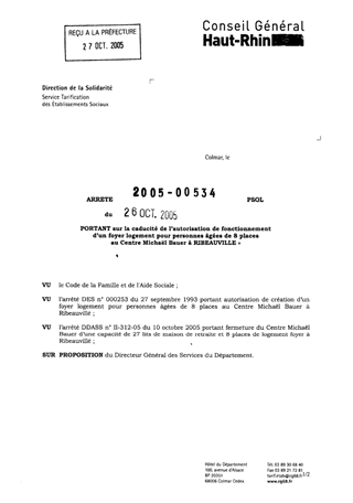 portant sur la caducité de l'autorisation de fonctionnement d'un foyer logement pour personnes âgées de 8 places au centre Michaël Bauer à RIBEAUVILLE. Resumé Pièces jointes ARRETE Assemblée : Non défini Date : 26/10/2005 Rapporteur : Non défini Collectivité : Conseil départemental du Haut-Rhin Direction : Non défini Service : Service de la Tarification des Etablissements Domaine : Personnes Agées Commission :