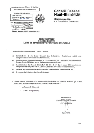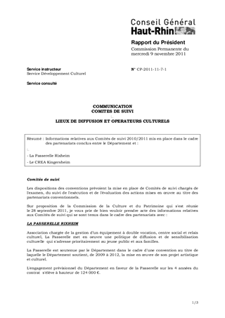 Informations relatives aux Comités de suivi 2010/2011 mis en place dans le cadre des partenariats conclus entre le Département et : - La Passerelle Rixheim - Le CREA Kingersheim