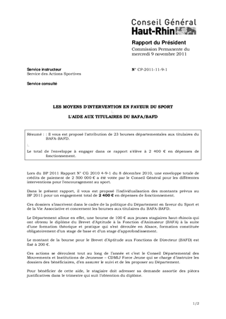: Il vous est proposé l'attribution de 23 bourses départementales aux titulaires du BAFA-BAFD. Le total de l'enveloppe à engager dans ce rapport s'élève à 2 400 € en dépenses de fonctionnement.