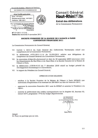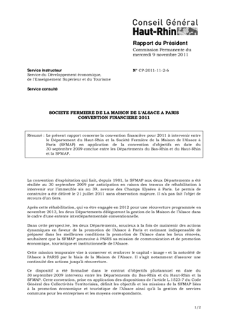 Le présent rapport concerne la convention financière pour 2011 à intervenir entre le Département du Haut-Rhin et la Société Fermière de la Maison de l'Alsace à Paris (SFMAP) en application de la convention d'objectifs en date du 30 septembre 2009 conclue entre les Départements du Bas-Rhin et du Haut-Rhin et la SFMAP.