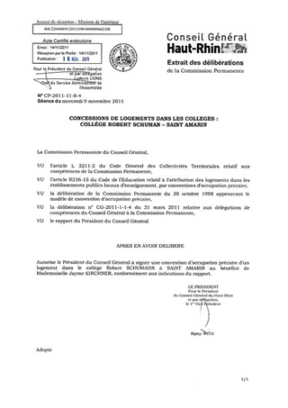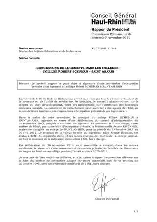 Le présent rapport a pour objet la signature d'une convention d'occupation précaire d'un logement au collège Robert SCHUMAN à SAINT AMARIN