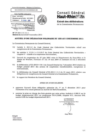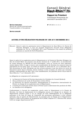 Dans le cadre du partenariat entre le Département du Haut-Rhin et le Powiat de Wroclaw (Pologne), il vous est proposé d’approuver l’accueil d’une délégation polonaise du 1er au 5 décembre 2011 pour l’animation d’un stand de produits polonais au marché de Noël d’Ensisheim