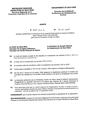 portant modification et extension de la capacité d'accueil de la maison d'enfants Marie Pascale Péan à MULHOUSE gérée par la Fondation Armée du Salut. Resumé Pièces jointes ARRETE Assemblée : Non défini Date : 28/10/2005 Rapporteur : Non défini Collectivité : Conseil départemental du Haut-Rhin Direction : Non défini Service : Service de la Tarification des Etablissements Domaine : Accueil d'enfants Commission :