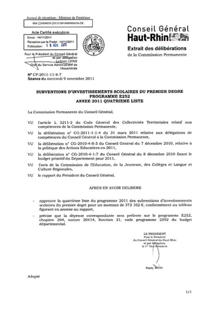 SUBVENTIONS D’INVESTISSEMENTS SCOLAIRES DU PREMIER DEGREPROGRAMME E252ANNEE 2011 QUATRIEME LISTE