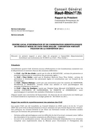 Le présent rapport a pour objet de proposer à l’assemblée départementale d'attribuer une subvention de 76.000 € au CLIC « Thur Doller ».