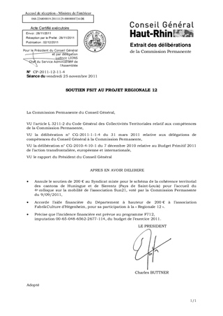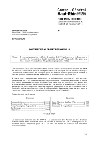 Il vous est proposé de réaffecter le soutien de 200€ prévu pour le colloque sur la mobilité de l'association Sun21 (annulé) au projet "Regionale 12", porté par l'association FabrikCulture d'Hégenheim [programme F712].