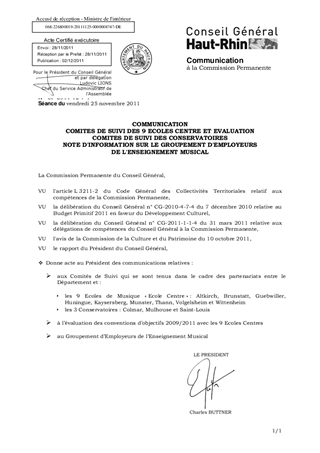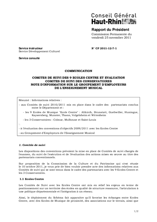Informations relatives : - aux Comités de suivi 2010/2011 mis en place dans le cadre des partenariats conclus entre le Département et : - les 9 Ecoles de Musique "Ecole Centre" : Altkirch, Brunstatt, Guebwiller, Huningue, Kaysersberg, Munster, Thann, Volgelsheim et Wittenheim - les 3 Conservatoires : Colmar, Mulhouse et Saint-Louis - à l'évaluation des conventions d'objectifs 2009/2011 avec les Ecoles Centre - au Groupement d'Employeurs de l'Enseignement Musical