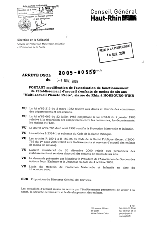 portant modification de l'autorisation de fonctionnement de l'établissement d'accueil d'enfants de moins de six ans "Multi-accueil Planète Récré", sis rue du Rhin à HORBOURG-WIHR. Resumé Pièces jointes ARRETE Assemblée : Non défini Date : 04/11/2005 Rapporteur : Non défini Collectivité : Conseil départemental du Haut-Rhin Direction : Non défini Service : Service de Protection Maternelle et Infantile Domaine : Accueil d'enfants Commission :