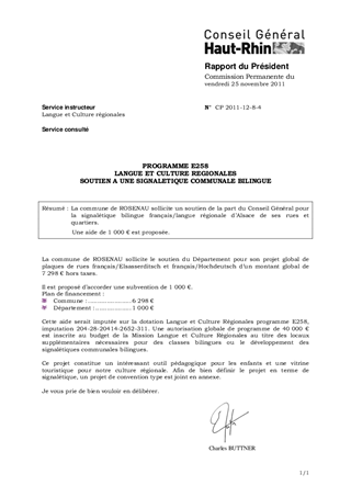 La commune de ROSENAU sollicite un soutien de la part du Conseil Général pour la signalétique bilingue français/langue régionale d’Alsace de ses rues et quartiers. Une aide de 1 000 € est proposée.