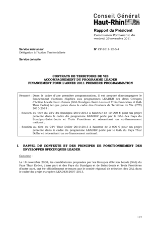 CONTRATS DE TERRITOIRE DE VIE ACCOMPAGNEMENT DU PROGRAMME LEADER FINANCEMENT POUR L'ANNEE 2011 PREMIERE PROGRAMMATION