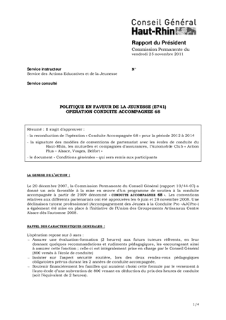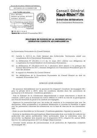 Il s'agit d’approuver : - la reconduction de l’opération « Conduite Accompagnée 68 » pour la période 2012 à 2014 - la signature des modèles de conventions de partenariat avec les écoles de conduite du Haut-Rhin, les mutuelles et compagnies d'assurances, l’Automobile Club « Action Plus – Alsace, Vosges, Belfort » - le document « Conditions générales » qui sera remis aux participants