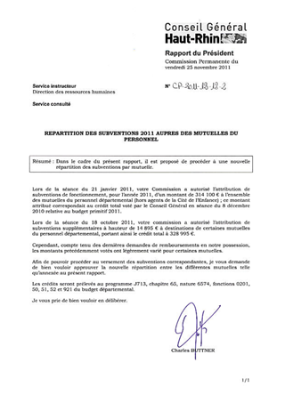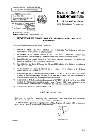 REPARTITION DES SUBVENTIONS 2011 AUPRES DES MUTUELLES DU PERSONNEL Resumé Pièces jointes DELIBERATION RAPPORT Assemblée : Commission Permanente Date : 25/11/2011 Rapporteur : Non défini Collectivité : Conseil départemental du Haut-Rhin Direction : Non défini Service : Direction Générale Adjointe des Solidarités et Ressources Domaine : Administration Commission : Commission Permanente