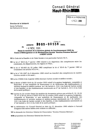 fixant le montant de la dotation globale de fonctionnement 2005 du centre d'hébergement et de réadaptation sociale "soutien femmes battues" à SAINT-LOUIS. Resumé Pièces jointes ARRETE Assemblée : Non défini Date : 04/11/2005 Rapporteur : Non défini Collectivité : Conseil départemental du Haut-Rhin Direction : Non défini Service : Service de la Tarification des Etablissements Domaine : Dotations financières Commission :