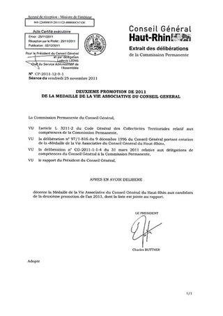 DEUXIEME PROMOTION DE 2011 DE LA MEDAILLE DE LA VIE ASSOCIATIVE DU CONSEIL GENERAL Resumé Pièces jointes DELIBERATION RAPPORT Assemblée : Commission Permanente Date : 25/11/2011 Rapporteur : Non défini Collectivité : Conseil départemental du Haut-Rhin Direction : Non défini Service : Cabinet Domaine : Aides / Subventions Commission : Commission Permanente