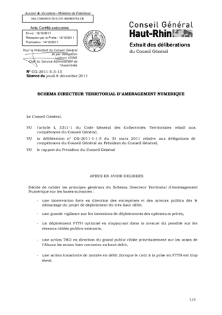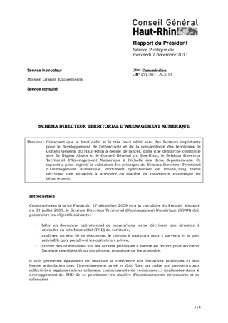 Conscient que le haut débit et le très haut débit sont des facteurs importants pour le développement de l’attractivité et de la compétitivité des territoires, le Conseil Général du Haut-Rhin a décidé de lancer, dans une démarche commune avec la Région Alsace et le Conseil Général du Bas-Rhin, le Schéma Directeur Territorial d’Aménagement Numérique à l’échelle des deux départements. Ce rapport a pour objectif la validation des principes du Schéma Directeur Territorial d'Aménagement Numérique, document opérationnel de moyen/long terme décrivant une situation à atteindre en matière de couverture numérique du département.