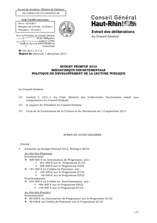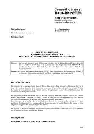 BUDGET PRIMITIF 2012 MEDIATHEQUE DEPARTEMENTALE POLITIQUE DE DEVELOPPEMENT DE LA LECTURE PUBLIQUE