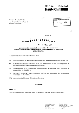 portant modification de la composition des membres du comité départemental des retraités et personnes âgées du Haut-Rhin (CODERPA). Resumé Pièces jointes ARRETE Assemblée : Non défini Date : 10/11/2005 Rapporteur : Non défini Collectivité : Conseil départemental du Haut-Rhin Direction : Non défini Service : Direction Adjointe Personnes Agées et Personnes Handicapées Domaine : Autres (non classés) Commission :