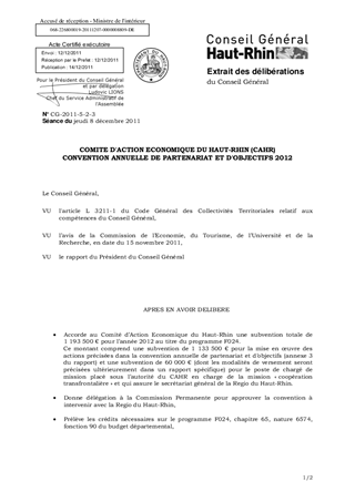 COMITE D'ACTION ECONOMIQUE DU HAUT-RHIN (CAHR) CONVENTION ANNUELLE DE PARTENARIAT ET D'OBJECTIFS 2012