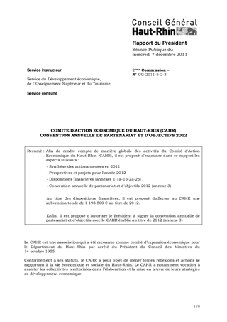 Afin de rendre compte de manière globale des activités du Comité d'Action Economique du Haut-Rhin (CAHR), il est proposé d'examiner dans ce rapport les aspects suivants : - Synthèse des actions menées en 2011 - Perspectives et projets pour l'année 2012 - Dispositions financières (annexes 1-1a-1b-2a-2b) - Convention annuelle de partenariat et d'objectifs 2012 (annexe 3) Au titre des dispositions financières, il est proposé d'affecter au CAHR une subvention totale de 1 193 500 € au titre de 2012. Enfin, il est proposé d'autoriser le Président à signer la convention annuelle de partenariat et d'objectifs avec le CAHR établie au titre de 2012 (annexe 3)