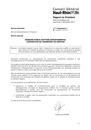 Le présent rapport a pour objet d'approuver un nouveau modèle de convention-type relatif au transfert de gestion et destiné à confier aux communes la gestion d'un site précis, ou une dépendance, du domaine public routier départemental.