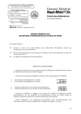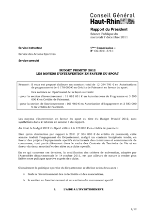 BUDGET PRIMITIF 2012 LES MOYENS D’INTERVENTION EN FAVEUR DU SPORT