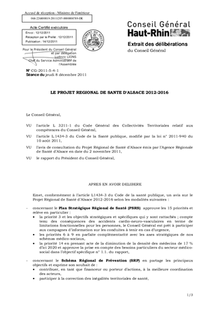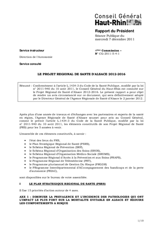 Conformément à l’article L.1434-3 du Code de la Santé Publique, modifié par la loi n° 2011-940 du 10 août 2011, le Conseil Général du Haut-Rhin est consulté sur le Projet Régional de Santé d’Alsace 2012–2016. Le présent rapport a pour objet de rendre un avis circonstancié sur ce document, qui sera définitivement adopté par le Directeur Général de l’Agence Régionale de Santé d’Alsace le 2 janvier 2012.