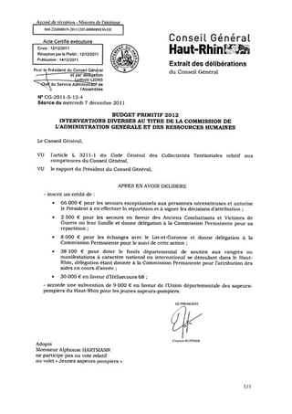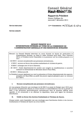 BUDGET PRIMITIF 2012 - INTERVENTIONS DIVERSES AU TITRE DE LA COMMISSION DE L'ADMINISTRATION GENERALE ET DES RESSOURCES HUMAINES. Resumé Pièces jointes DELIBERATION RAPPORT Assemblée : Conseil General Date : 07/12/2011 Rapporteur : Non défini Collectivité : Conseil départemental du Haut-Rhin Direction : Non défini Service : Cabinet Domaine : Administration Commission : Assemblée Départementale