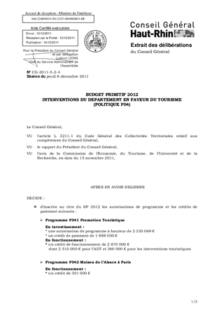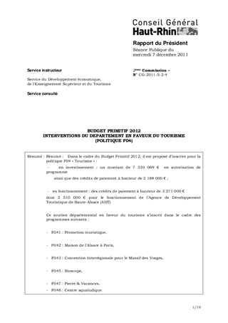 Résumé : Dans le cadre du Budget Primitif 2012, il est proposé d’inscrire pour la politique F04 « Tourisme » : - en investissement : un montant de 7 330 069 € en autorisation de programme ainsi que des crédits de paiement à hauteur de 2 188 000 € ; - en fonctionnement : des crédits de paiement à hauteur de 3 271 000 € dont 2 510 000 € pour le fonctionnement de l’Agence de Développement Touristique de Haute-Alsace (ADT) Ce soutien départemental en faveur du tourisme s’inscrit dans le cadre des programmes suivants : - F041 : Promotion touristique, - F042 : Maison de l’Alsace à Paris, - F043 : Convention Interrégionale pour le Massif des Vosges, - F045 : Bioscope, - F047 : Pierre & Vacances, - F048 : Centre aqualudique.
