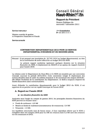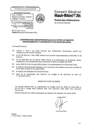 CONTRIBUTION DEPARTEMENTALE 2012 POUR LE SERVICE DEPARTEMENTAL D'INCENDIE ET DE SECOURS (SDIS) Resumé Pièces jointes DELIBERATION RAPPORT Assemblée : Conseil General Date : 07/12/2011 Rapporteur : Non défini Collectivité : Conseil départemental du Haut-Rhin Direction : Non défini Service : Mission Contrôle de Gestion et Organisation Domaine : Administration Commission : Assemblée Départementale