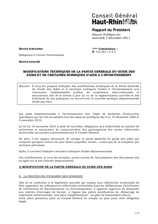 Il vous est proposé d’adopter des modifications techniques de la Partie Générale du Guide des Aides et à certaines rubriques d’aides à l’investissement aux communes, établissements publics de coopération intercommunale et associations afin de le mettre à jour au vu de la réglementation nouvelle et des évolutions de nos politiques, en accord avec la nouvelle politique départementale d’aide aux tiers.