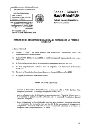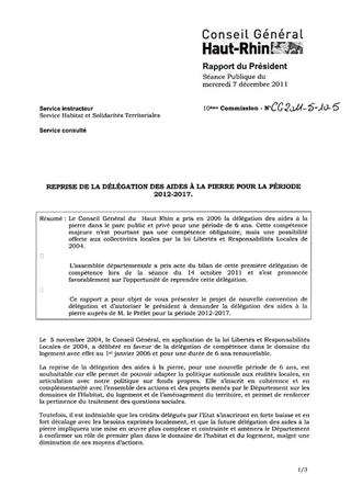 REPRISE DE LA DELEGATION DES AIDES A LA PIERRE POUR LA PERIODE 2012-2017. Resumé Pièces jointes DELIBERATION RAPPORT Assemblée : Conseil General Date : 07/12/2011 Rapporteur : Non défini Collectivité : Conseil départemental du Haut-Rhin Direction : Non défini Service : Service Habitat et Solidarités Territoriales Domaine : Habitat Commission : Assemblée Départementale